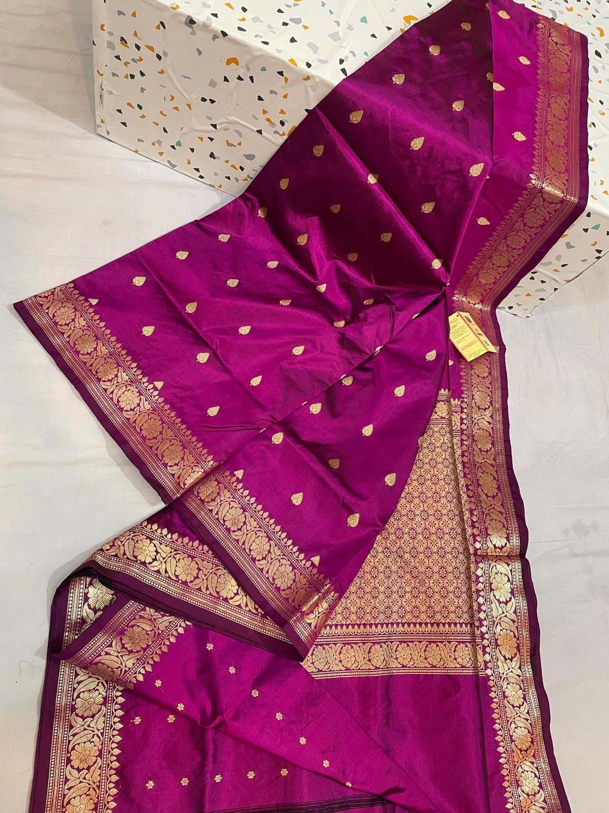 Purple colour slick border katan banarasi with golden thread work.